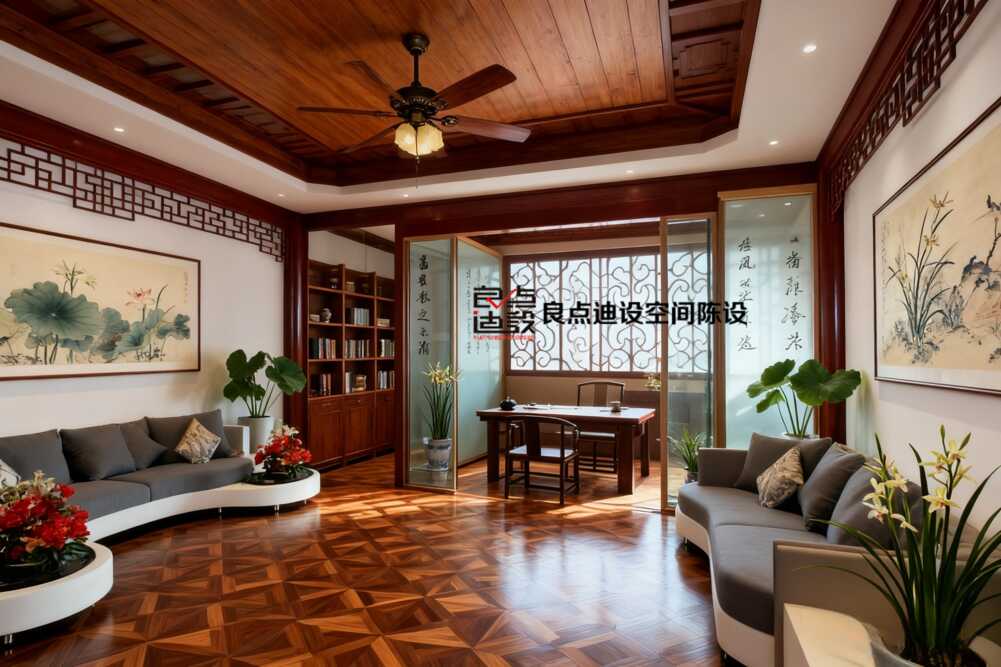 先抬頭看!木質(zhì)天花板搭配復(fù)古吊扇,這組合絕了。古韻瞬間拉滿,但一點不顯老氣。墻上那幾幅荷花掛畫選得特別妙,留白恰到好處,意境一下子就有了。