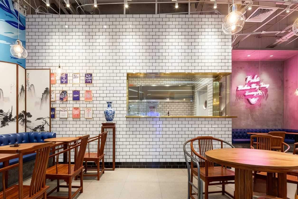 寶子們!今天刷到這家名為"Polish Bling"的餐廳設(shè)計,真的有被驚艷到!誰說新中式一定要一本正經(jīng)?看看人家這波操作——左邊是典雅的水墨山水屏風(fēng)配藍(lán)色絲絨沙發(fā),右邊居然是粉色霓虹燈墻,這種混搭也太敢玩了!