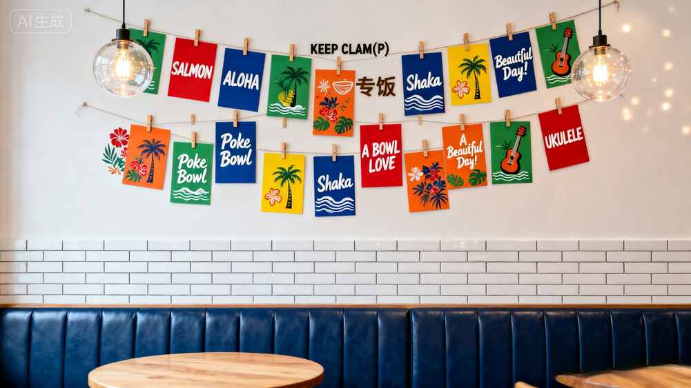 先看主角:白墻上掛著一排彩色卡片,用原木夾子固定,簡(jiǎn)單卻賊有巧思??ㄆ嫌≈癝ALMON”“ALOHA”這種俏皮英文,搭配棕櫚樹(shù)、小花朵圖案,瞬間帶出夏威夷般的輕松調(diào)調(diào)。往下瞄,白色瓷磚墻+深藍(lán)色皮質(zhì)卡座,再配個(gè)木質(zhì)圓桌,層次感立馬就出來(lái)了。***絕的是頭頂那兩盞透明球形吊燈,光線一打,溫馨指數(shù)飆升,拍照根本不用濾鏡!