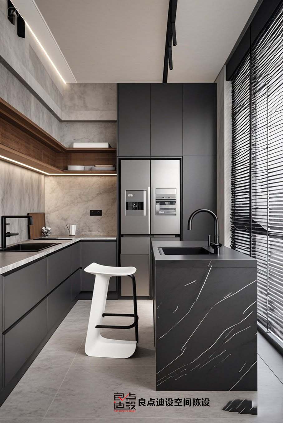 島臺(tái)***是這個(gè)廚房的C位擔(dān)當(dāng)。黑色臺(tái)面搭配白色高腳凳,經(jīng)典黑白配***不會(huì)過時(shí)。它既能當(dāng)作操作臺(tái)面,又能變身簡(jiǎn)單的用餐區(qū),早上來個(gè)快手早餐啥的,簡(jiǎn)直不要太方便。
