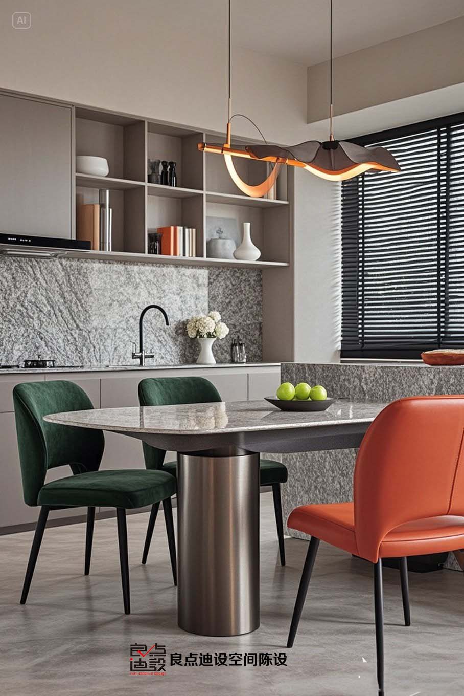 餐桌是那種簡(jiǎn)約又不失質(zhì)感的款式,底部的圓柱設(shè)計(jì)很有特色。搭配的兩把椅子??,綠色和橙色撞色,也太吸睛了吧!色彩的碰撞讓整個(gè)空間都鮮活起來(lái)~