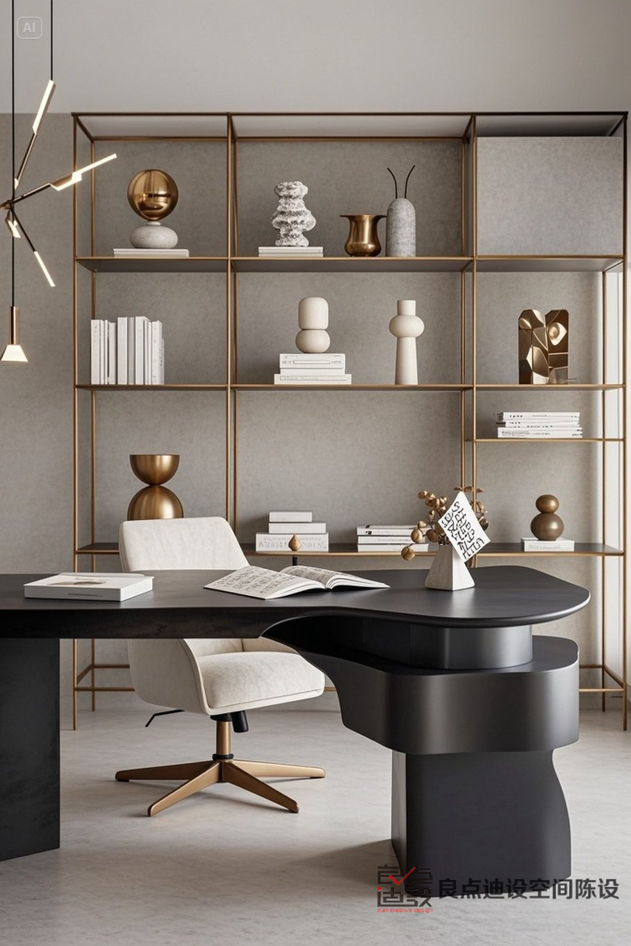 先看這張圖片,一整個高級住了有沒有~這書房的風(fēng)格我愿稱之為現(xiàn)代簡約與輕奢的***融合。