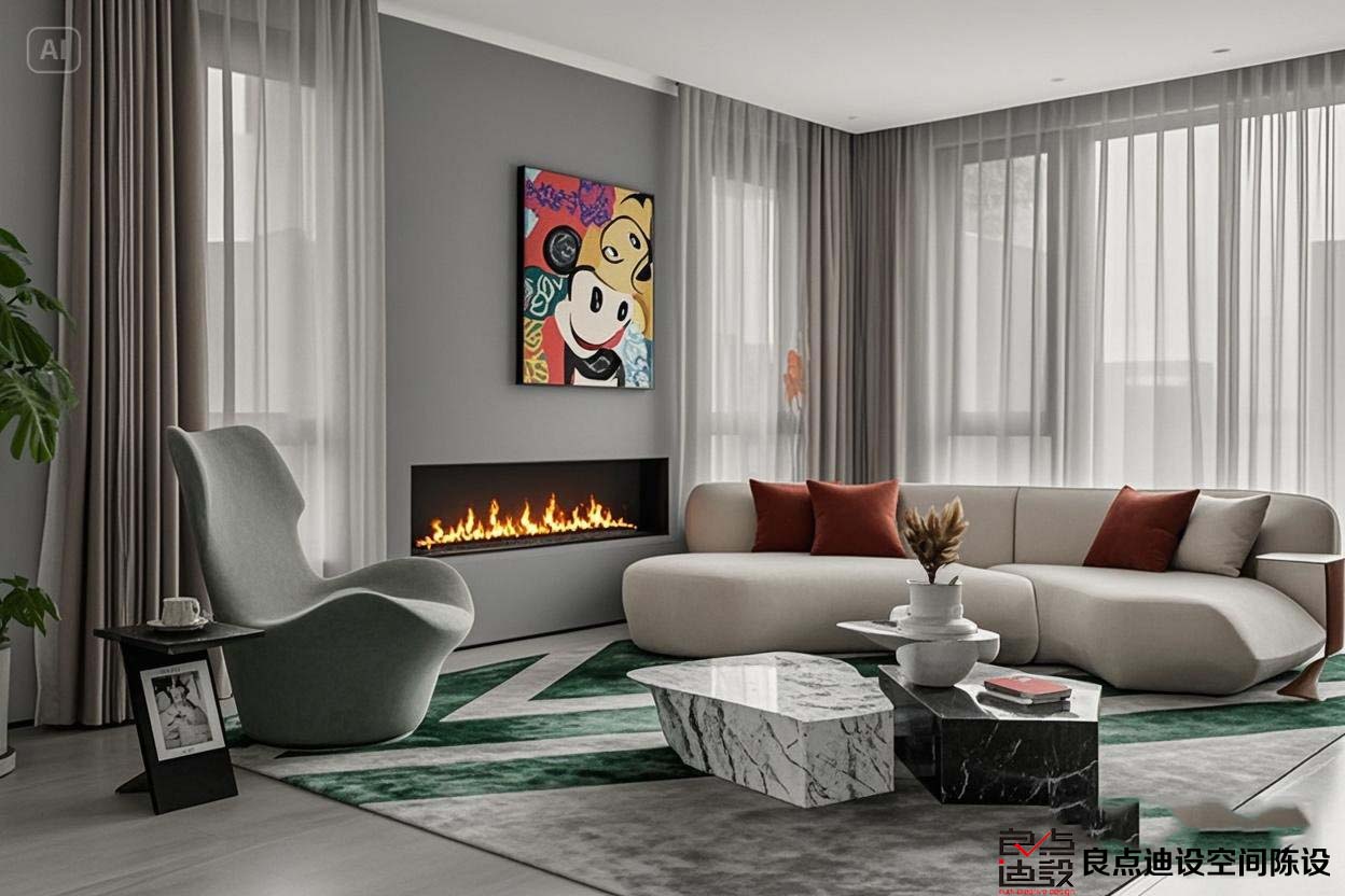 地毯、吊燈、沙發(fā)墻上的照片全都充滿現(xiàn)代色彩。
