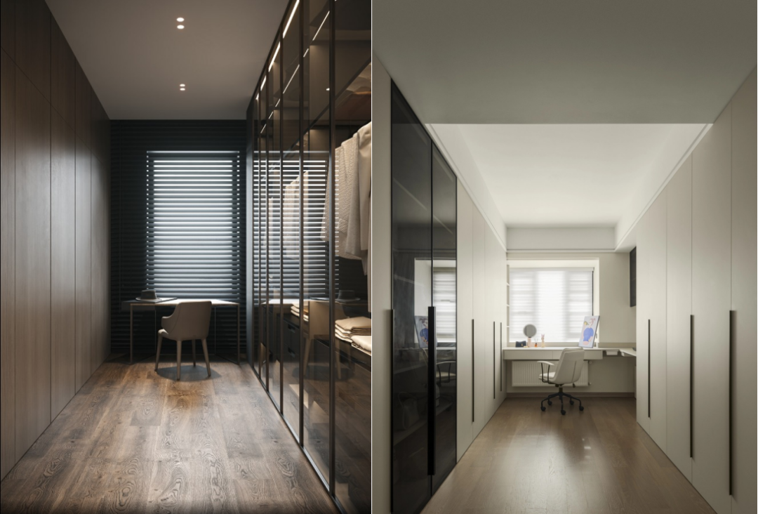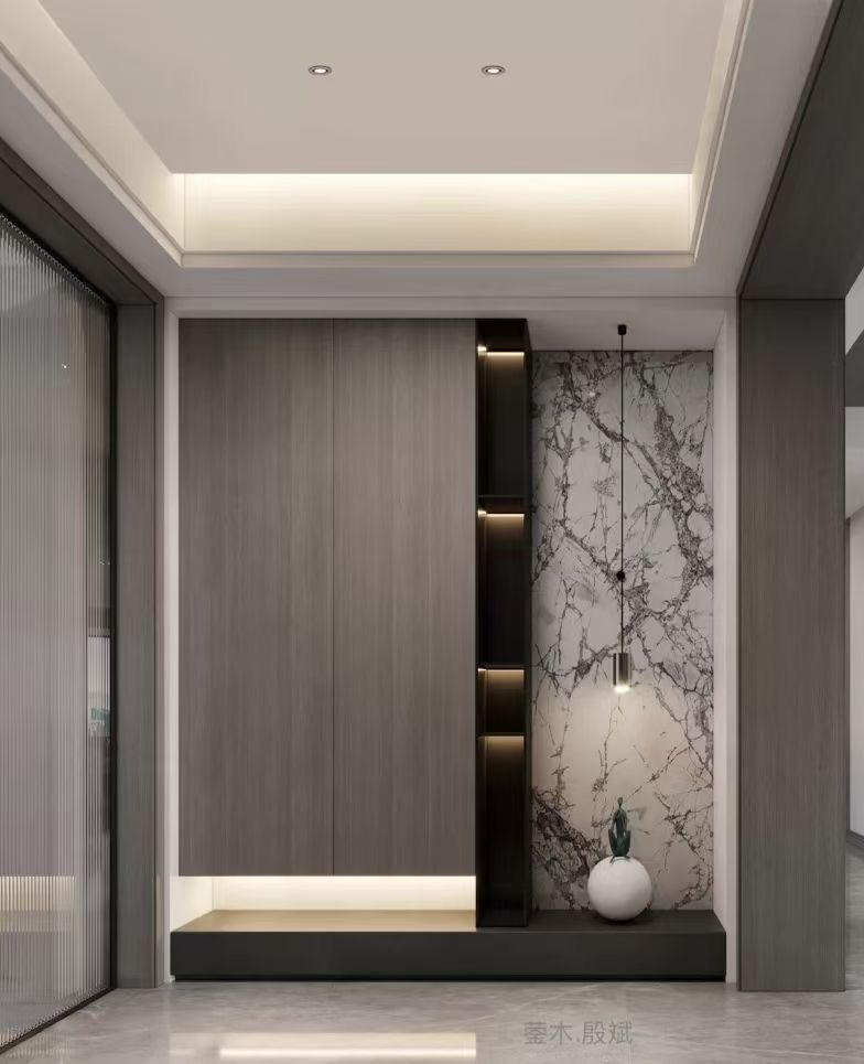 對(duì)于無(wú)玄關(guān)的戶(hù)型,入戶(hù)門(mén)左右側(cè)有較長(zhǎng)的靠墻區(qū)域,且安置鞋柜后不會(huì)阻礙空間的利用,那么可以將鞋柜平行布局在門(mén)體的一側(cè)。柜子與門(mén)體位于同一方向,進(jìn)門(mén)后的空間感依舊保持寬松舒適,又能實(shí)現(xiàn)較大面積的儲(chǔ)物收納空間,狹小的轉(zhuǎn)角區(qū)域亦可以得到合理利用。