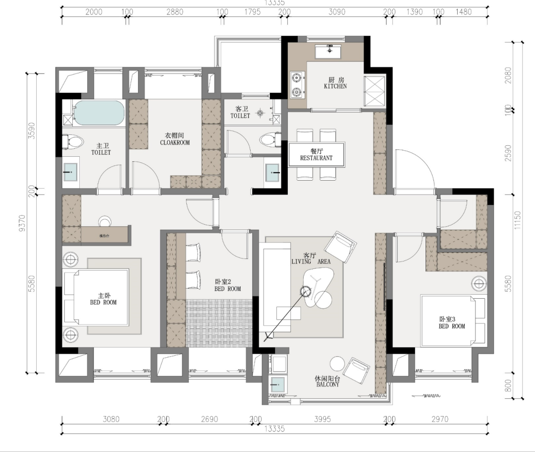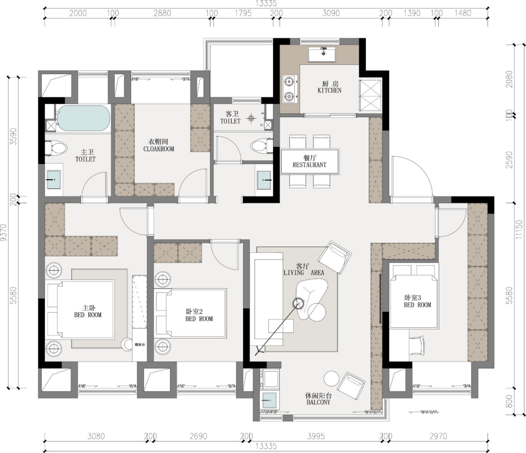 設(shè)計(jì)思路:陽(yáng)臺(tái)打通,打造多功能陽(yáng)臺(tái)。增加門(mén)廳換鞋柜和餐廳餐邊柜的儲(chǔ)物功能,保留獨(dú)立書(shū)房。臥室3增加儲(chǔ)物空間。