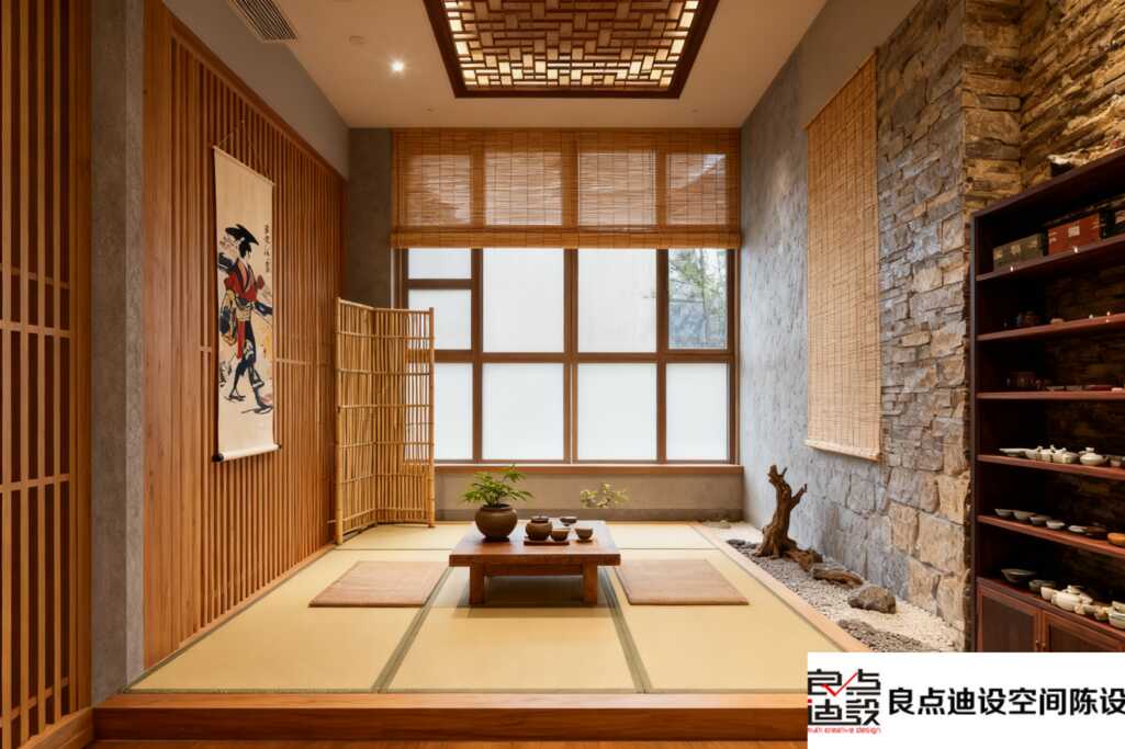 軟裝的靈魂,往往藏在細節(jié)里。墻面上沒有跟風(fēng)網(wǎng)紅元素,而是選擇了經(jīng)典的日式浮世繪和寥寥數(shù)筆的山水墨畫,藝術(shù)氣息悄然而生。旁邊的博古架更是我的心頭好,上面錯落有致地陳列著手作陶器茶具、竹制茶則和一些枯山水小景擺件,每一件都像是一個故事。這正是“良點迪設(shè)空間陳設(shè)”團隊的巧妙之處——用物件講故事,讓空間充滿可讀性。