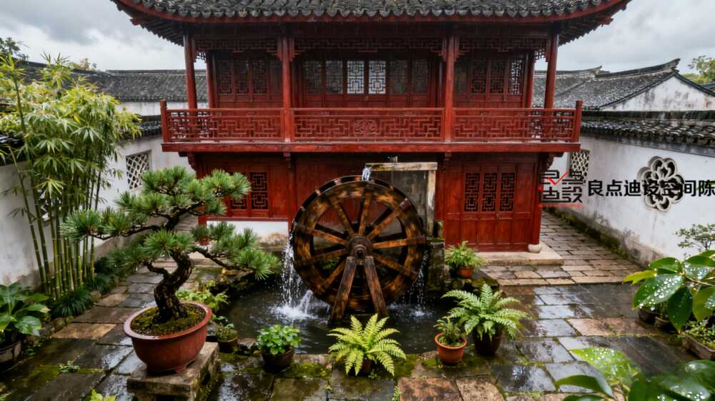 進(jìn)門(mén)就被這個(gè)木質(zhì)水車(chē)圈粉了。潺潺流水聲瞬間隔絕外界喧囂,搭配青磚地面古樸質(zhì)感拉滿。翠竹松樹(shù)錯(cuò)落有致,每個(gè)角落都是風(fēng)景。