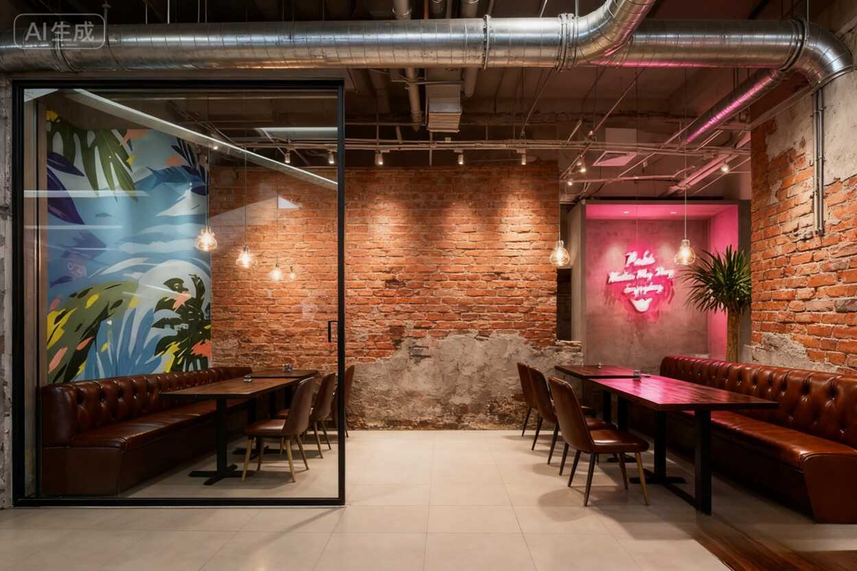 ***吸睛的***是左側(cè)那面彩色墻繪!在水泥灰的主色調(diào)里突然跳出這么一抹亮色,整個(gè)空間瞬間就活了起來。右手邊那面紅墻更是絕絕子,配上霓虹燈的柔和光暈,氛圍感直接拉滿。這種冷暖色調(diào)的碰撞,設(shè)計(jì)師真是玩明白了!