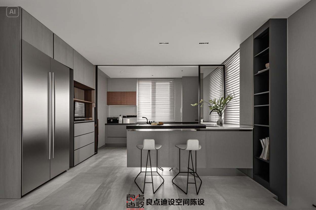 廚房以使用功能為主,頂面為石膏板吊頂,櫥柜采用鏡面烤漆咖色柜門(mén),乳白色大理石臺(tái)面,咖色的地磚很耐臟。