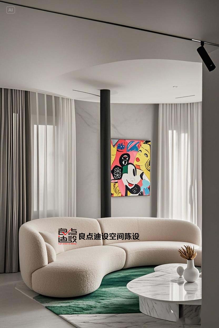 再來說說搭配的弧形沙發(fā)。它就像一個(gè)溫柔的懷抱,給人滿滿的安全感。柔和的線條和硬朗的墻面、柱子形成了鮮明的對(duì)比,在視覺上產(chǎn)生了強(qiáng)烈的沖擊力。坐上去,柔軟的質(zhì)感包裹著身體,讓人瞬間放松下來。而且弧形的設(shè)計(jì)還增加了空間的流動(dòng)感,讓客廳看起來更加寬敞。想象一下,在忙碌了一天之后,回到家躺在這舒適的沙發(fā)上,看著墻上的畫,所有的疲憊都煙消云散了。