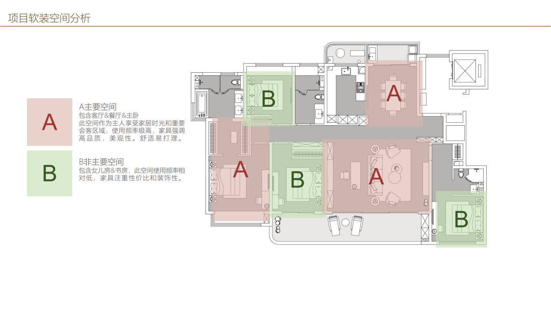 對(duì)于整體空間,一定要有主次之分(如上圖),整個(gè)空間一定以客餐廳和主臥作為整體空間的 主要空間,使用頻率相對(duì)更高,家具更強(qiáng)調(diào)品質(zhì)和美觀,同時(shí)具備舒適性,便于打理。