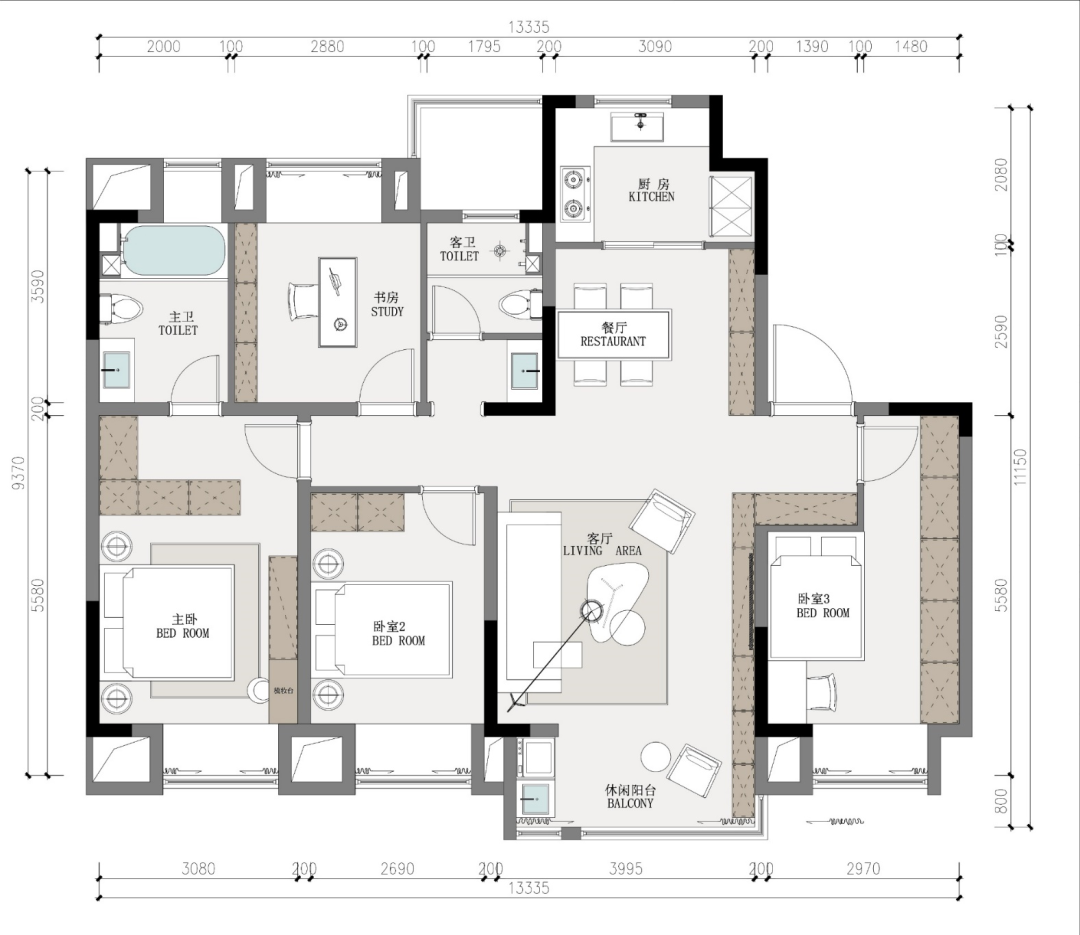 設(shè)計(jì)思路:陽(yáng)臺(tái)打通,打造多功能陽(yáng)臺(tái)。增加門(mén)廳換鞋柜和餐廳餐邊柜的儲(chǔ)物功能,保留獨(dú)立書(shū)房。臥室3增加儲(chǔ)物空間。