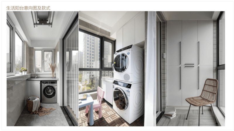 在生活陽臺上設計洗衣池,可以選一體式臺盆,帶三面擋水。遵循上烘下洗的原則,衣服拿出來就可以穿,減少晾曬時間。轉(zhuǎn)角的空間剛好收納家政工具,適當利用洞洞板進行收納,更加整潔。