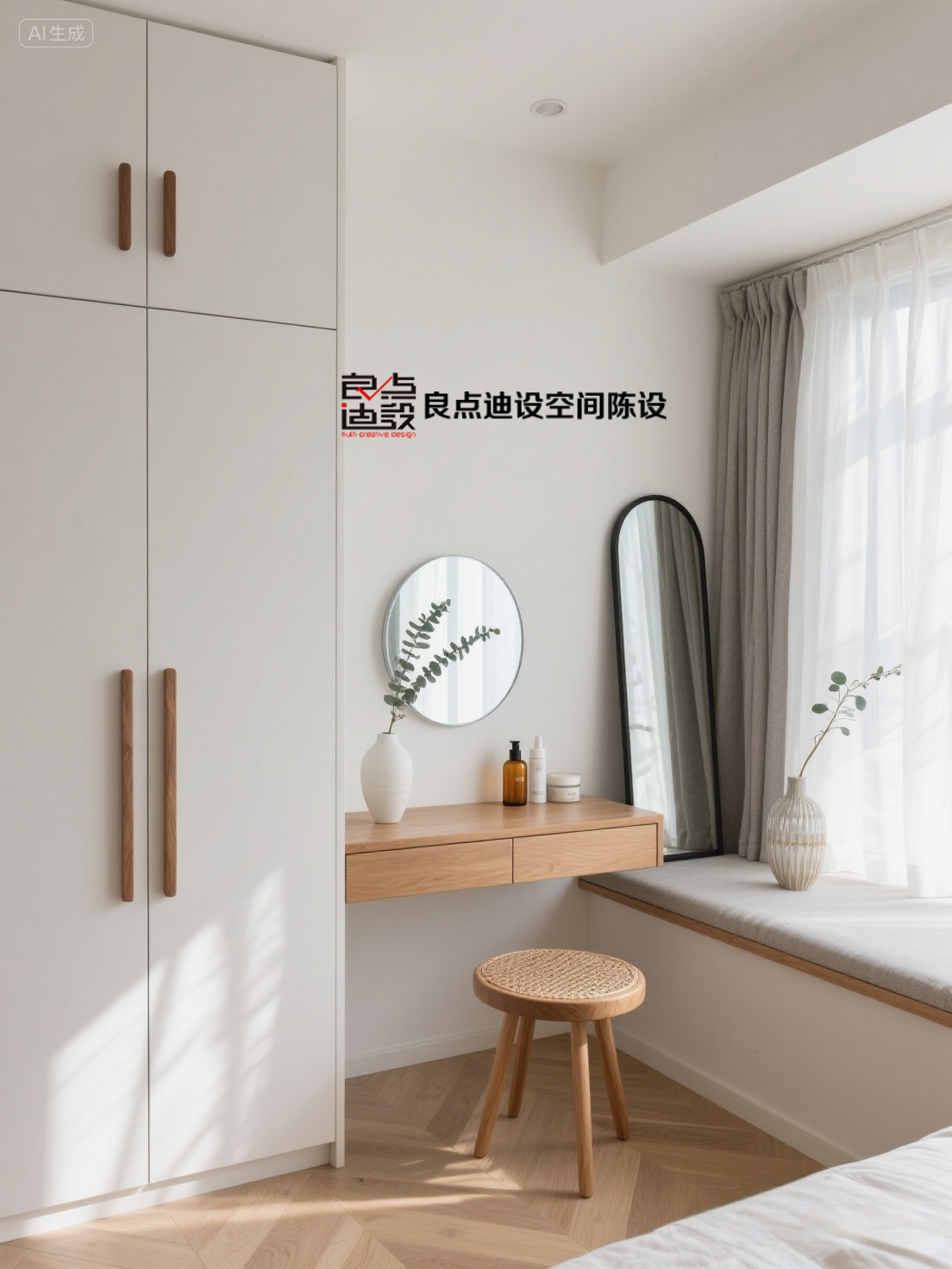 靠窗別浪費(fèi)!安排一張敦實(shí)木質(zhì)桌+橢圓鏡神仙組合。桌面隨意放盞暖光小燈。白天梳妝辦公光線***,晚上點(diǎn)燈秒變氛圍感擔(dān)當(dāng),隨手一拍都是ins大片。